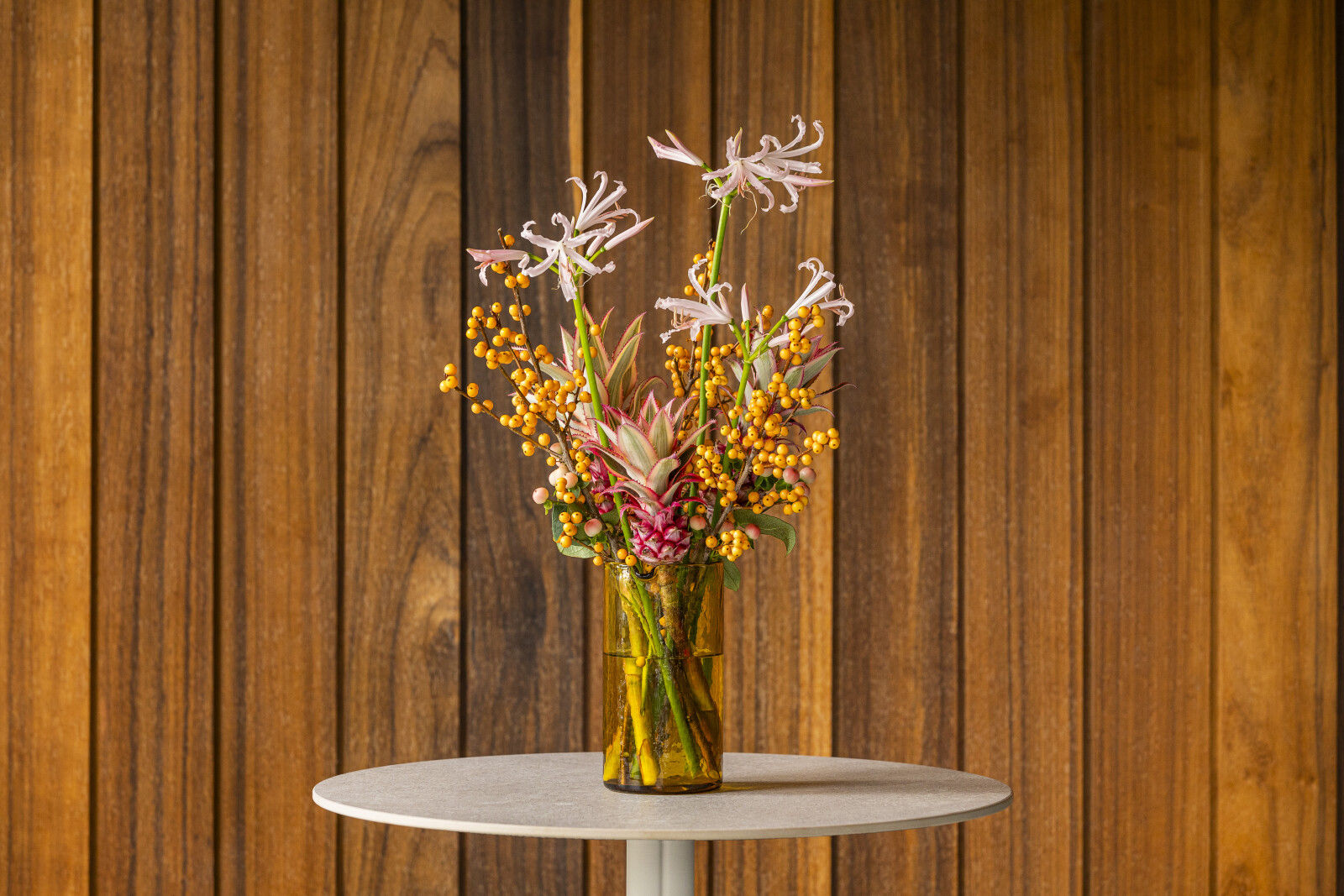 Les ananas sont naturellement robustes et se conservent bien, ce qui leur confère une longue durée de vie dans une composition florale. Ils résistent au dessèchement et conservent longtemps leur forme et leur couleur.